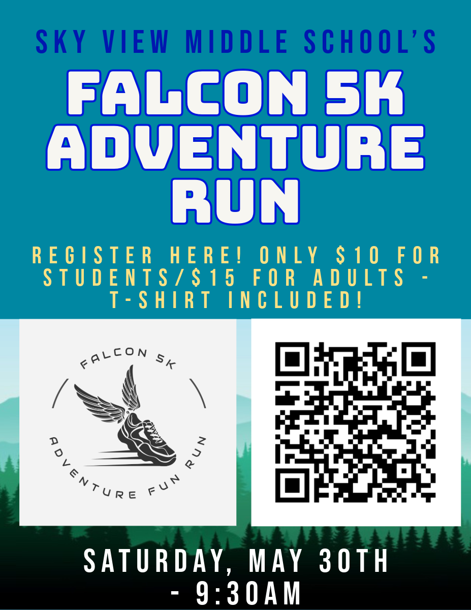 Join us for a fun-filled, family-friendly run/walk event at Sky View Middle School! REGISTER TODAY! Shirt sizes guaranteed for those who register before May 6th.